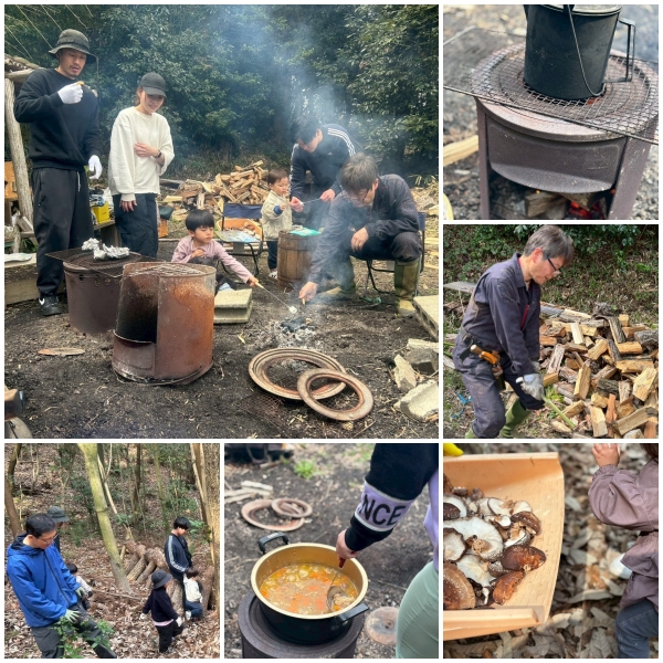 本日の活動は、焚き火、薪割、椎茸収穫。焼きしいたけ、マシュマロ、羽釜ご飯とスジ肉カレーです。