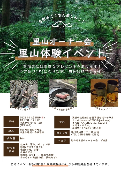 里山体験イベント令和7年第3弾の案内です。 11月30日(日)10時から12時(集合時間9時半) 詳しくはメールでお問い合わせしてください。 参加費無料 芋掘り・焼き芋体験・美味しいスイーツ・椎茸プレゼント他 申込用紙( […]